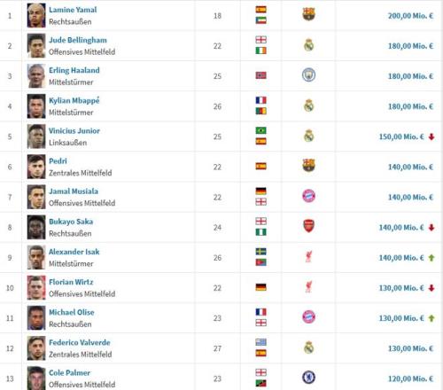 雷速体育10月17日宣 德转刚刚更新了英超球员身价,切尔西后腰凯塞多身价首次涨至1亿欧。 德转显示,目前五大联赛共有18名球员身价破1亿欧。 其中亚马尔2亿欧身价领衔,贝林、哈兰德、姆巴佩均1.8亿欧紧随其后。 罗德里遭遇两连跌,目前身价9000万欧。 |