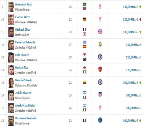 凯塞多加入亿元先生俱乐部!五大联赛目前18人身价超1亿欧