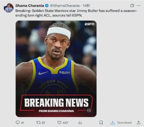 宣布了,没有好消息。 爆料王Shams:巴特勒前十字韧带撕裂,赛季报销......